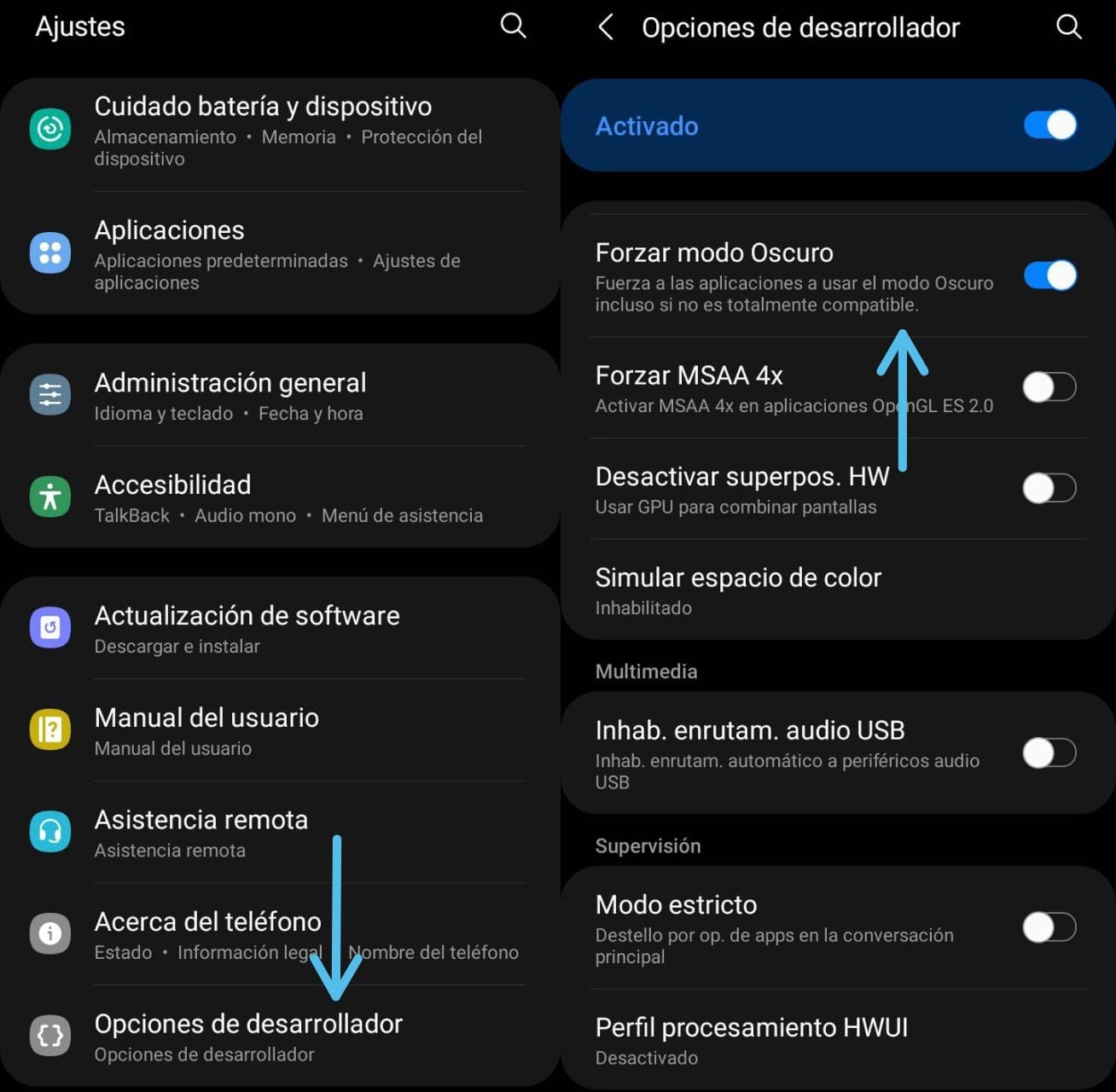| Dispositivos con AMOLED | Activar modo oscuro para ahorrar batería | Todas las apps con fondo negro real |