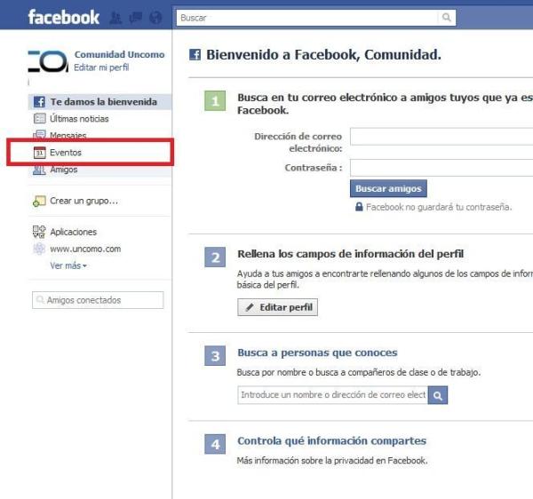 Acceder a la sección de eventos en Facebook