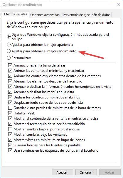 | Ajustar para mejor rendimiento | Panel de Control > Rendimiento | Alto: desactiva múltiples efectos visuales |